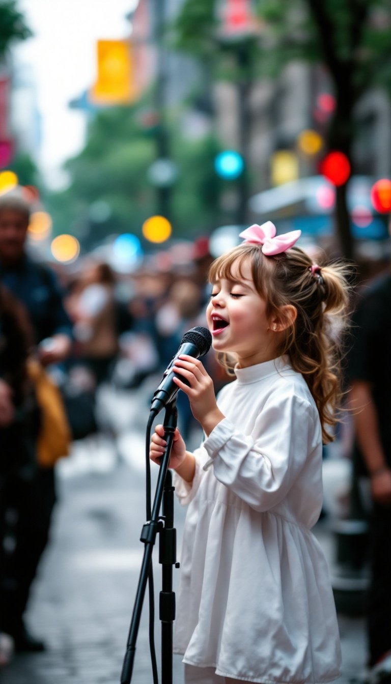 It was a typical afternoon in the city—buskers playing guitars, street vendors calling out their deals, tourists snapping photos. Among the noise and movement, a young girl stood on the corner, gripping a microphone. She looked out at the crowd, her face calm but determined.